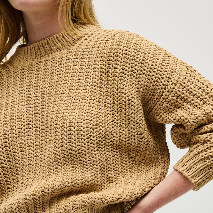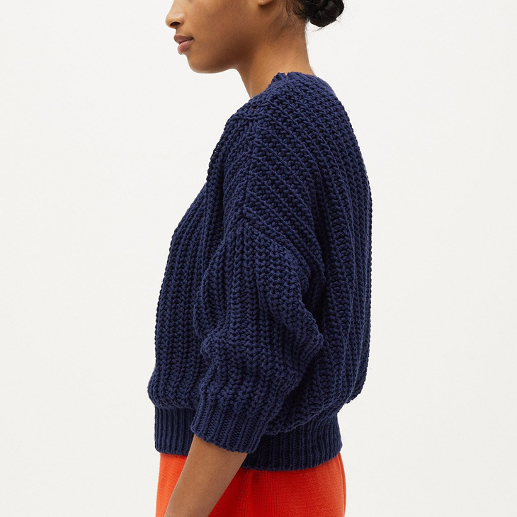Many styles are knit from thick yarns that create the brand’s distinctive look: